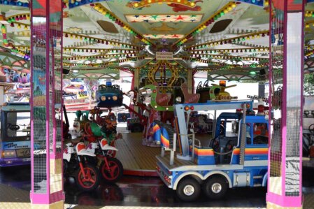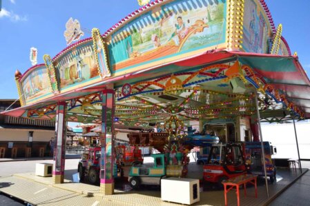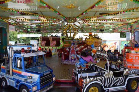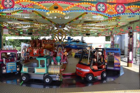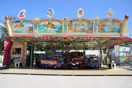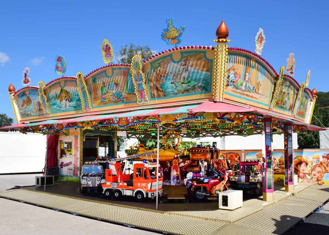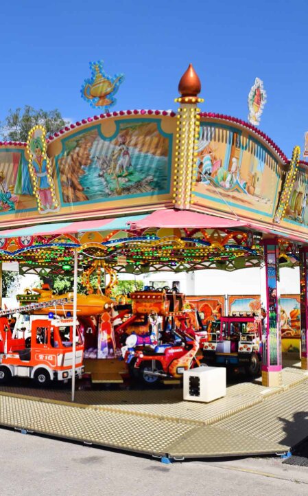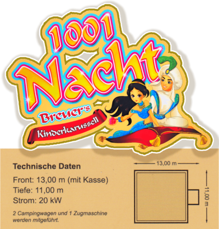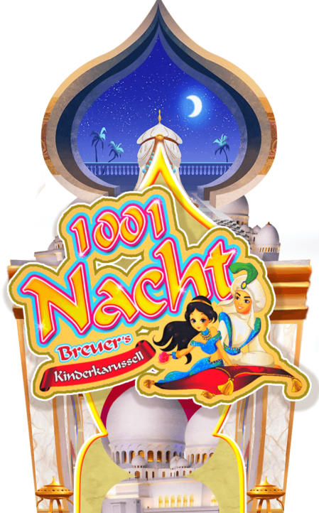 1001 Nacht ist die abwechslungsreiche und interessante Sensation für alle Festplatzbesucher. In einer vielfältig bestückten Besatzung bestreiten die Kinder die Fahrt in diversen Fahrzeugen, auf Motorrädern, aber auch auf Tier- und Fabelwesen. Die Fahrzeuge sind teilweise mit hochwertigen Sprachmodulen ausgestattet. In der Karussellmitte entdeckt man 4 pneumatisch betriebene Chaisen, die von den kleinen Fahrgästen eigenhändig gesteuert werden können. Diese Technik besitzt ihren eigenen Reiz und bietet unseren Gästen eine zusätzliche Attraktion. Erwachsene können die kleinen Fahrgäste während der Fahrt selbstverständlich begleiten.