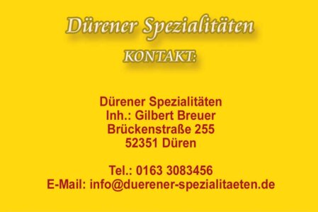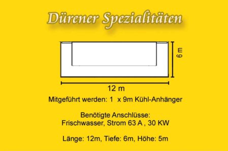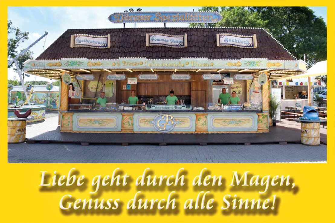 Das Warenangebot der „Dürener Spezialitäten“ ist auf unsere Kunden abgestimmt und stets ein Quell größter Kundenzufriedenheit. Neben Schaschlik, Spießbraten und Currywurst bieten wir unseren Gästen auch Schnitzel, Frikadellen und zahlreiche Wurstspezialitäten sowie natürlich goldgelbe Pommes Frites als Beilage. Das Highlight ist unser stets frisch vor den Augen des Kunden zubereiteter, knuspriger Backfisch. Ofenfrische, selbstverständlich im Imbisswagen gebackene Brötchen runden - ebenfalls zu unseren Fisch- und Fleischspezialitäten - unser Warenangebot ab.